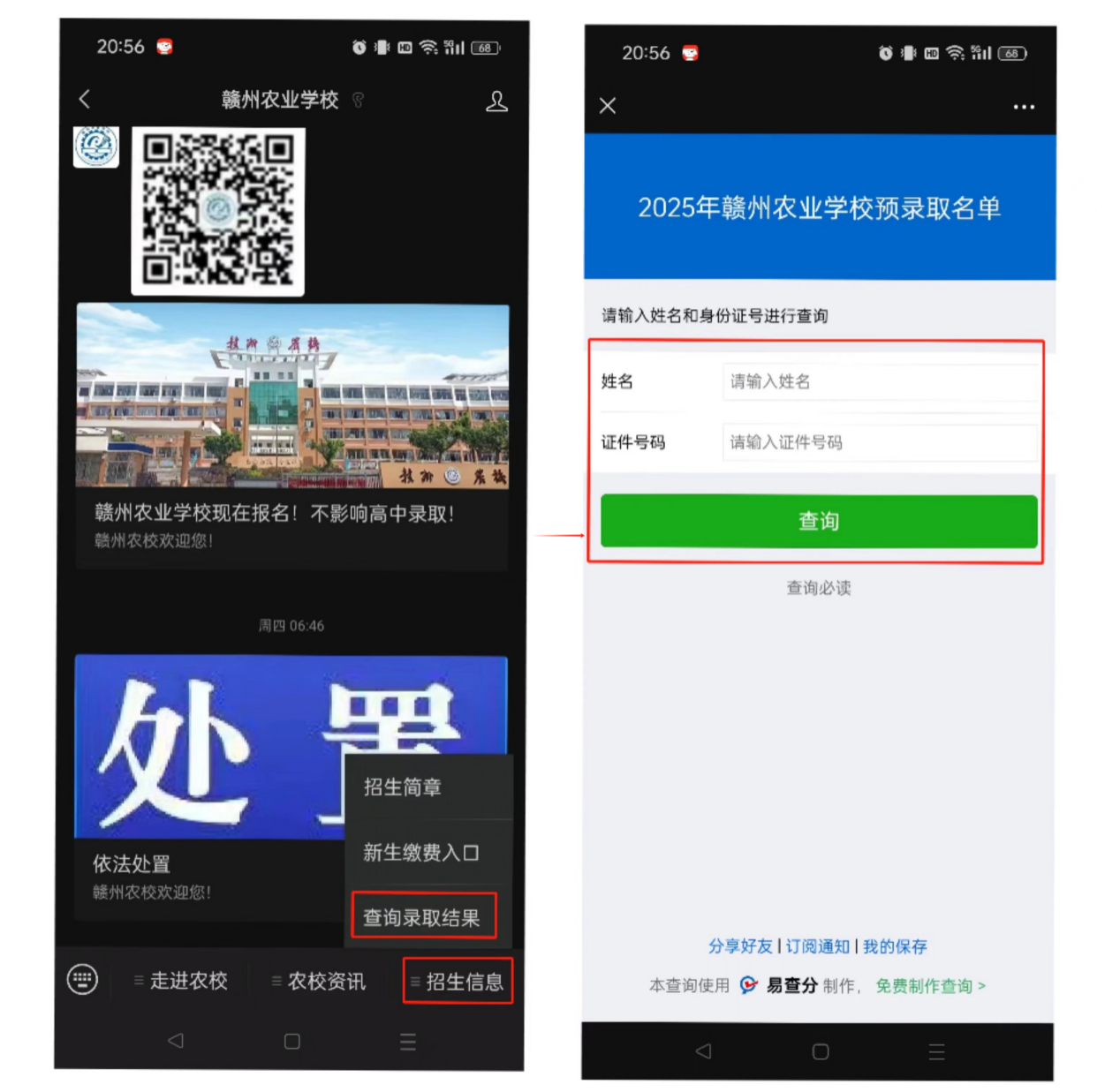 第二步:点击底部菜单栏“招生信息”→“查询录取结果”,输入姓名和证件号码(身份证号码)→点击“查询”即可。