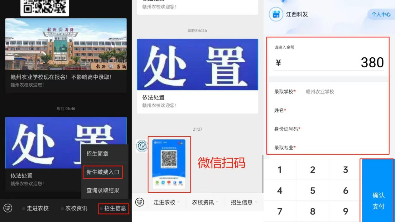 进入“赣州农业学校”官方微信公众号,点击底部菜单栏“招生信息”->“新生缴费入口”,扫码缴费。缴费成功后,请妥善保存缴费截图。(如后期被其他高中学校录取,可将取通知书图片发送至邮箱:gznxxsfzgzz@163.com,可原路退相关费用)