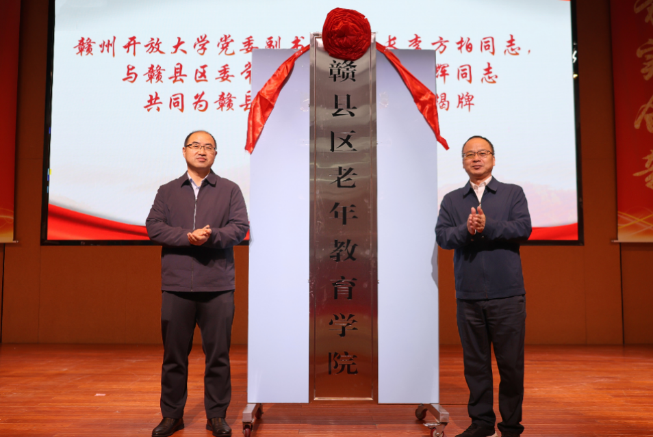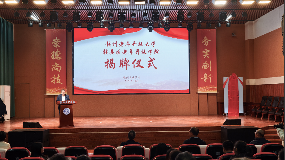 11月18日上午,赣县区老年教育学院揭牌仪式在我校顺利进行。赣州市开放大学党委副书记、校长李方柏,赣州开放大学党委委员、副校长卢旗英,赣县区委常委、副区长郭彦辉,赣州农业学校校长欧阳荣华等出席活动。赣县区老年教育学院的正式运行,标志着赣州老年教育体系建设的进一步完善,将有效提升区域老年人的幸福指数。