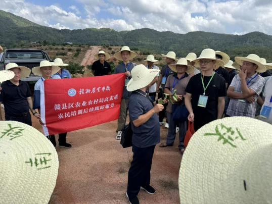 近日,我校联合赣县区农业农村局,在赣县区南塘镇开展赣县区高素质农民培训跟踪服务回访交流会。参会者有区农业农村局、南塘镇政府、赣州农业学校领导和脐橙水稻种植、无人机植保等农业专家及2024年培训学员。