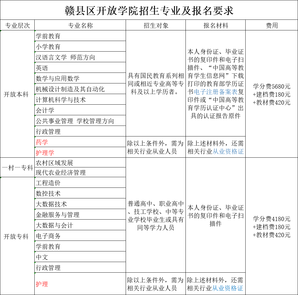 赣县区开放学院开设多种专业。本科招生对象为具有国民教育系列相同或相近专业高等专科及以上学历者。护理学专业招生对象还须是持有护士执业资格证书的在职人员。已经获得国家开放大学护理专业专科学历的“专升本”新生,可不再提供相关执业资格证书证明材料。药学专业招生对象为医药卫生等相关行业从业人员。专科招生对象为普通高中、职业高中、技工学校和中等专业学校毕业生或具有同等学力人员。护理专业招生对象为中等专业学校毕业、持有护士执业资格证书的人员。