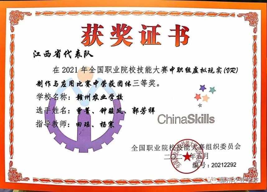 2021年全国职业院校技能大赛中职组属拟现实(VR)制作与应用比赛中荣获团体二等奖